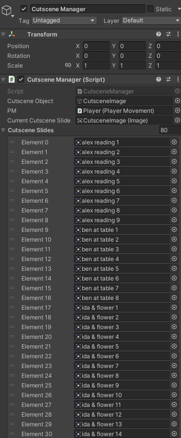 next slide in the list until they reach the last one, in which case the cutscene manager will disable the cutscene canvas as well as the trigger’s collider to ensure the cutscene can’t be repeated. I’ve found this system to be much more efficient and less tedious to work on than