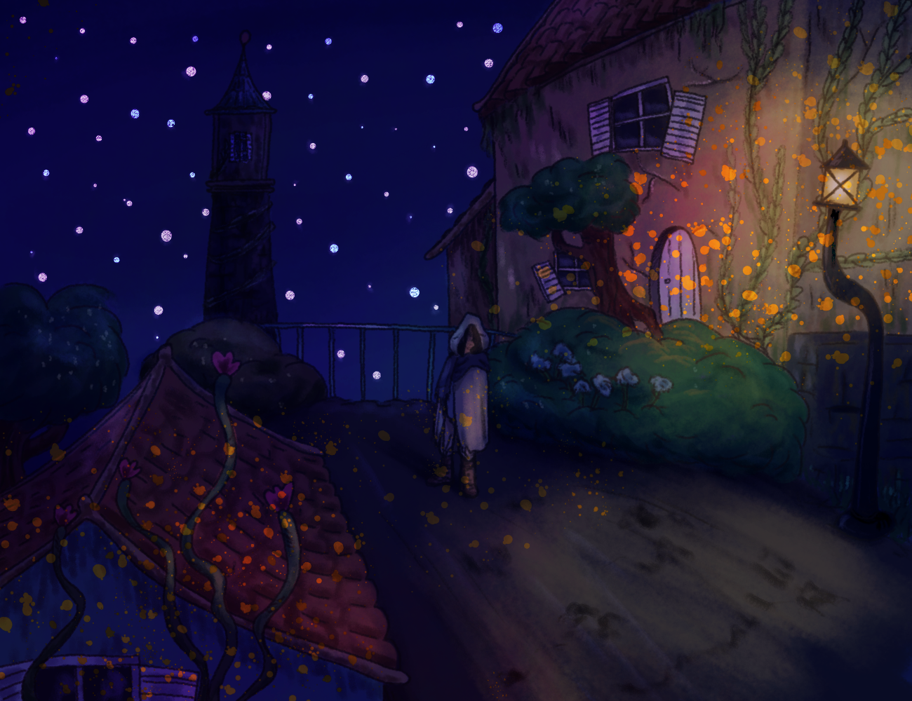 Concept art for the main setting of Ushinatta, an old town inspired by Portmerion in North Wales.